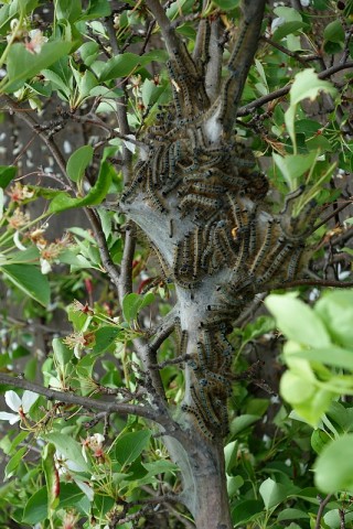 进入6月以来,瓦拉干镇很多人家的果树发生大面积虫害,特别是山丁子树受害严重。由于今春雨水大,潮湿,加上最近气温升高,这种虫子迅速繁殖,很多居民园内果树(李子树、山丁子、稠李等)大片严重受害,侵蚀树叶,塔河县病防站的朋友及时进行了防治。据查,这种害虫叫天幕毛虫